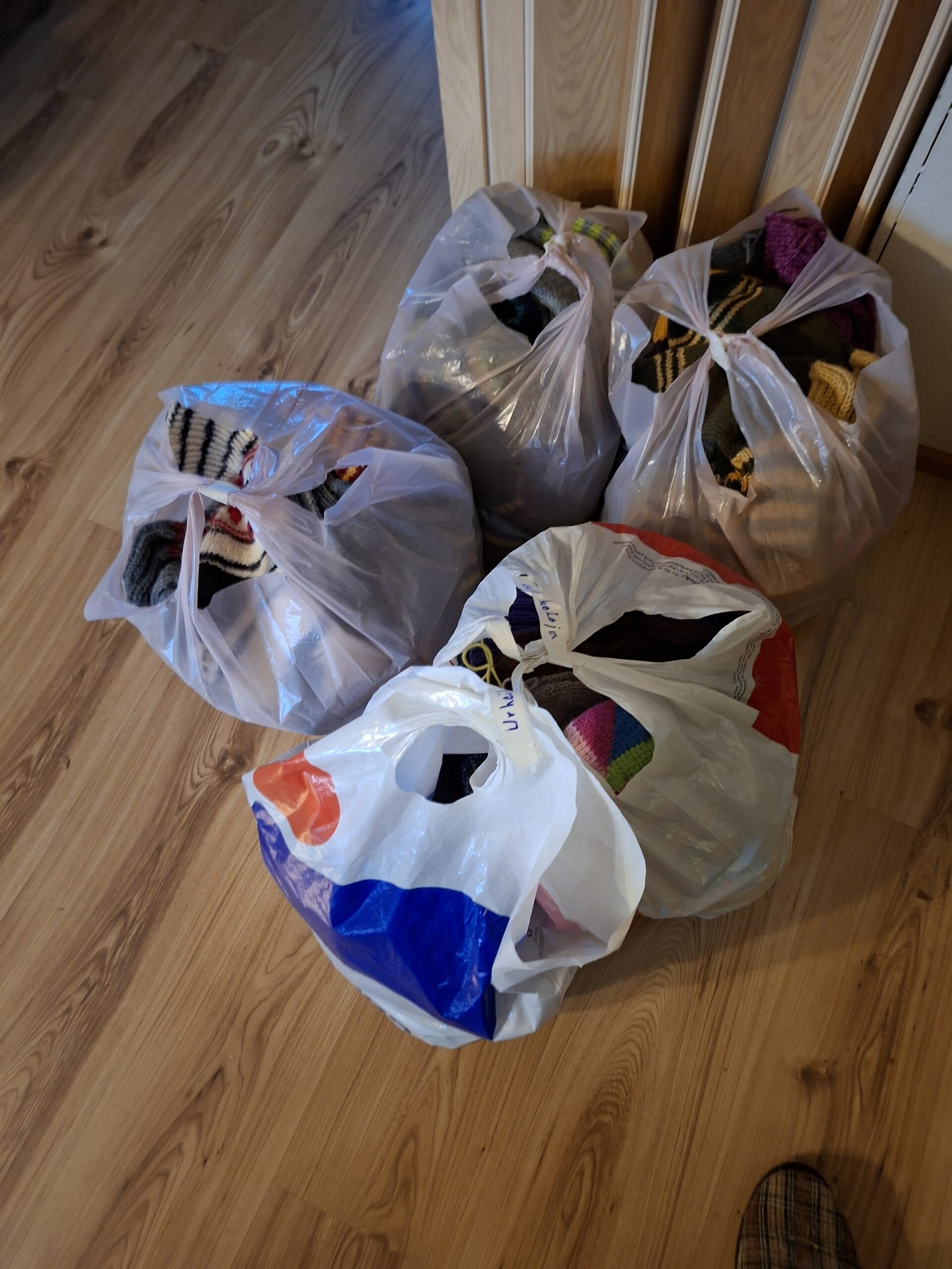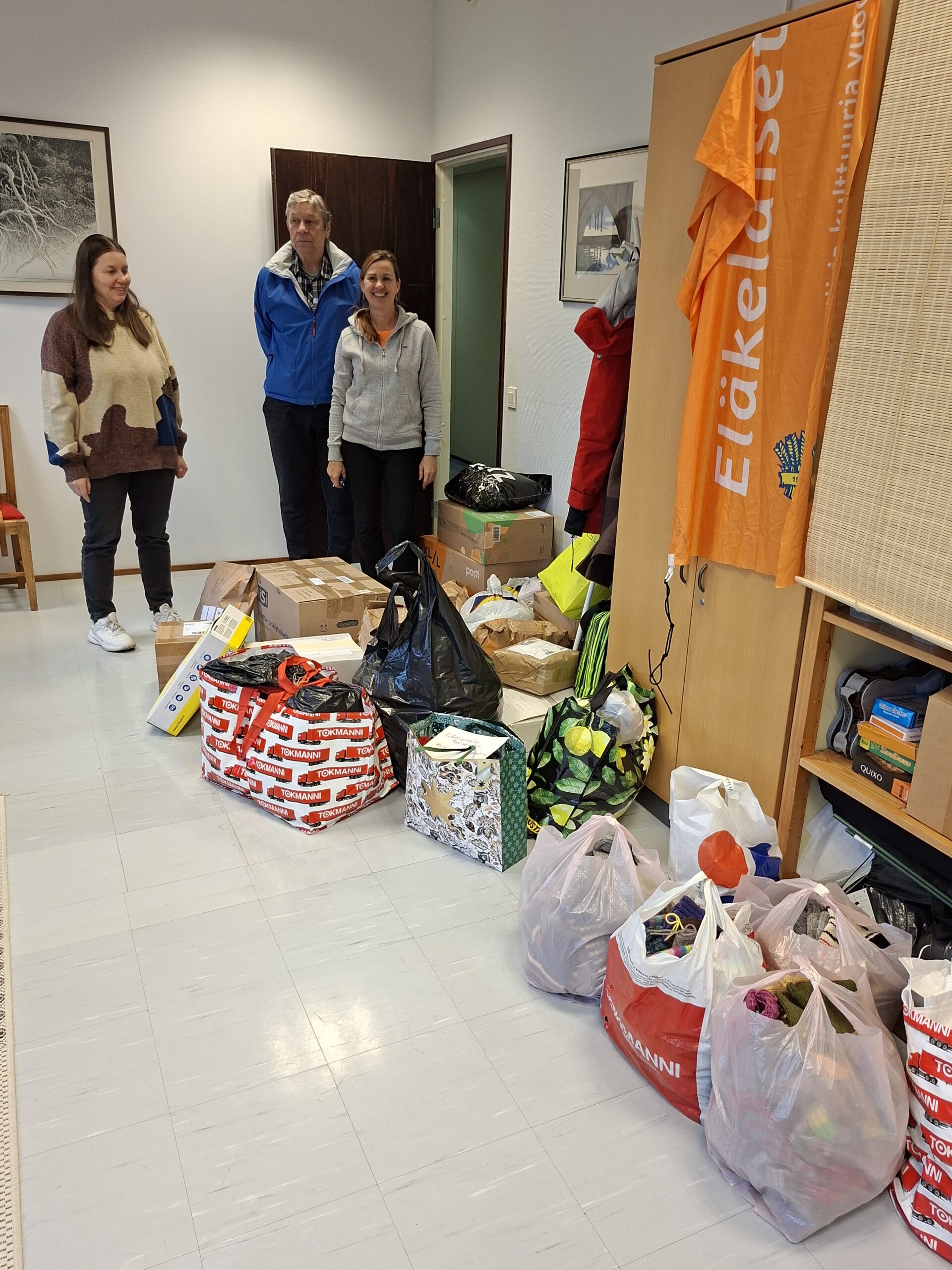 Yhteensä Heikki ja Risto veivät 27.11.2025 Eläkeläisten toimistolle viisi muovikassillista sukkia. Eva ja Evgenia ottivat sukat ilolla vastaan ja kertoivat, että tiedossa on yli tuhat paria miesten sukkia lähetykseen.